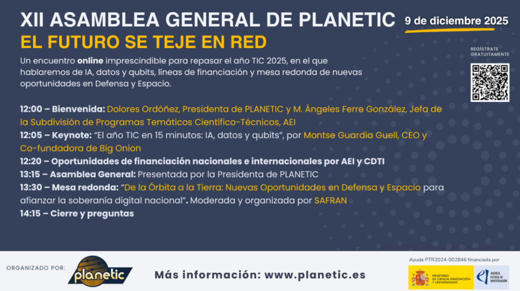 Bajo el lema “El Futuro TIC se Teje en Red”, contaremos con una keynote que repasará los hitos recientes en IA, datos y qubits; se presentarán oportunidades de financiación nacionales por parte de la AEI e internacionales (Convocatoria AgData y Horizon Europe Cluster 4 por parte del CDTI); se expondrán nuestras iniciativas y planes futuros; y se celebrará una mesa redonda sobre nuevas oportunidades en Defensa y Espacio para afianzar la soberanía digital nacional organizado y moderado por SAFRAN.