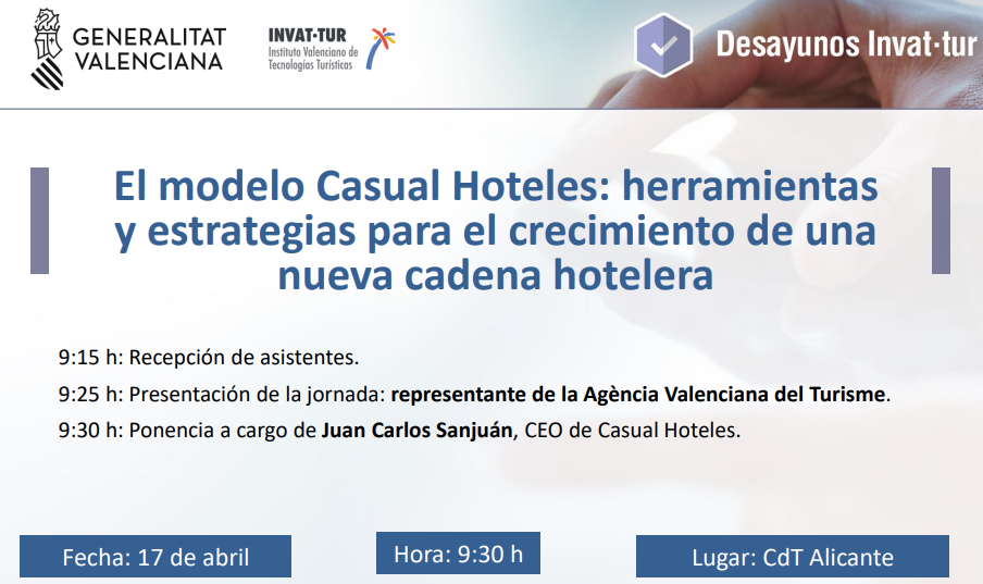 El próximo 17 de abril a las 9:30 h se celebrará el Desayuno Invat·tur titulado El modelo Casual Hoteles: herramientas y estrategias para el crecimiento de una nueva cadena hotelera, a cargo de Juan Carlos Sanjuán, CEO de Casual Hoteles.