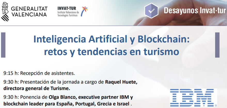 El próximo 24 de abril a las 9:15 h se celebrará el Desayuno Invat·tur titulado Inteligencia Artificial y Blockchain: retos y tendencias en turismo, a cargo de Olga Blanco, executive partner IBM y blockchain leader para España, Portugal, Grecia e Israel.