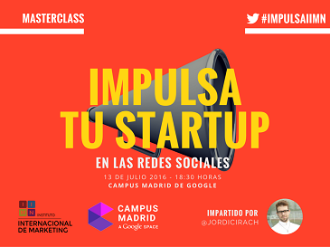 Si estás creando una startup, tienes una idea de negocio o simplemente estás construyendo tu proyecto personal, el próximo miércoles 13 de Julio te esperamos en CAMPUS MADRID, IMPULSA: una MasterClass pilotada por Jordi Cirach donde descubrirás lo queSnapchat, Periscope, Instagram, Facebook Live o los Influencers pueden hacer por ti.